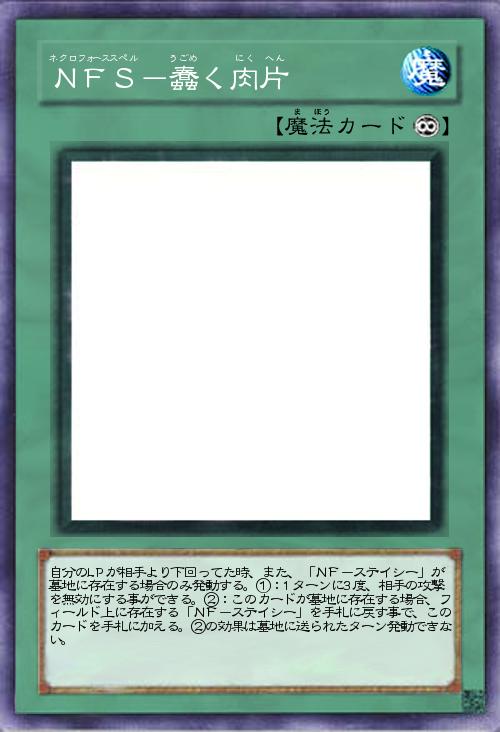 | 自分のLPが相手より下回ってた時、また、「NF-ステイシー」が墓地に存在する場合のみ発動する。①:1ターンに3度、相手の攻撃を無効にする事ができる。②:このカードが墓地に存在する場合、フィールド上に存在する「NF-ステイシー」を手札に戻す事で、このカードを手札に加える。②の効果は墓地に送られたターン発動できない。 | |||