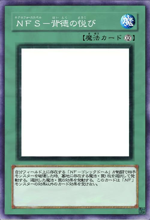 | 自分フィールド上に存在する「NF-ゴシックドール」が戦闘で相手モンスターを破壊した時、墓地に存在する魔法・罠1枚を選択して発動する。選択した魔法・罠の効果を発動する。このカードは「NF」モンスターの効果以外のカード効果を受けない。 | |||