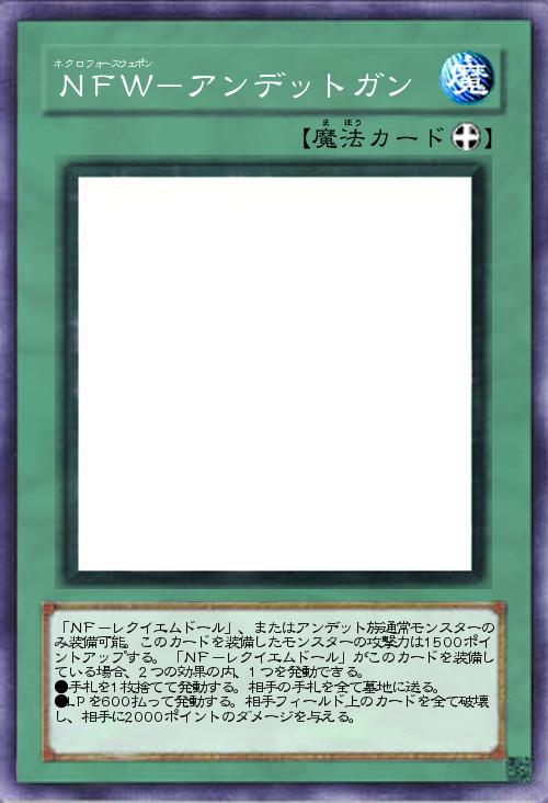 | 「NF-レクイエムドール」、またはアンデット族通常モンスターのみ装備可能。このカードを装備したモンスターの攻撃力は1500ポイントアップする。「NF-レクイエムドール」がこのカードを装備している場合、2つの効果の内、1つを発動できる。 ●手札を1枚捨てて発動する。相手の手札を全て墓地に送る。 ●LPを600払って発動する。相手フィールド上のカードを全て破壊し、相手に2000ポイントのダメージを与える。 | |||