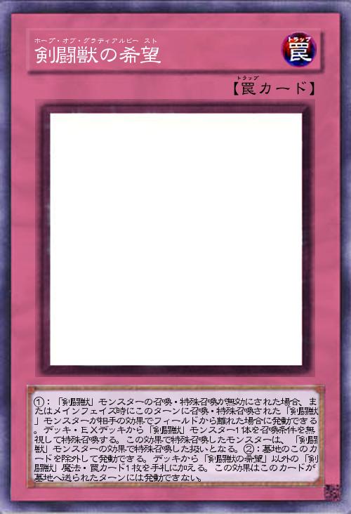 | ①:「剣闘獣」モンスターの召喚・特殊召喚が無効にされた場合、またはメインフェイズ時にこのターンに召喚・特殊召喚された「剣闘獣」モンスターが相手の効果でフィールドから離れた場合に発動できる。デッキ・EXデッキから「剣闘獣」モンスター1体を召喚条件を無視して特殊召喚する。この効果で特殊召喚したモンスターは、「剣闘獣」モンスターの効果で特殊召喚した扱いとなる。②:墓地のこのカードを除外して発動できる。デッキから「剣闘獣の希望」以外の「剣闘獣」魔法・罠カード1枚を手札に加える。この効果はこのカードが墓地へ送られたターンには発動できない。 | |||