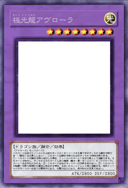 | 「アヴローラ」モンスター×3 このカードは自分フィールドの上記のモンスターをリリースする事でもEXデッキから融合召喚でき(「融合」は必要としない)、このカードは融合召喚でのみEXデッキから特殊召喚できる。 ①:このカードが融合召喚に成功した場合、フィールドのカード1枚を対象として発動できる。そのカードを除外し、デッキからそのカードと同じ種類(魔法・罠・モンスター)の「アヴローラ」カード1枚を手札に加える。②:このカードは他のモンスターの効果を受けない。③:このカードが戦闘・効果で破壊され墓地に存在する場合、お互いのエンドフェイズ毎に発動する。相手フィールドのモンスターは全て攻撃表示になり、攻撃力は0になり、表示形式を変更できない。 | |||