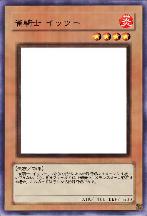 | 「雀騎士 イッツー」の①の方法による特殊召喚は1ターンに1度しかできない。①:自分フィールドに「雀騎士」Xモンスターが存在する場合、このカードは手札から特殊召喚できる。 | |||