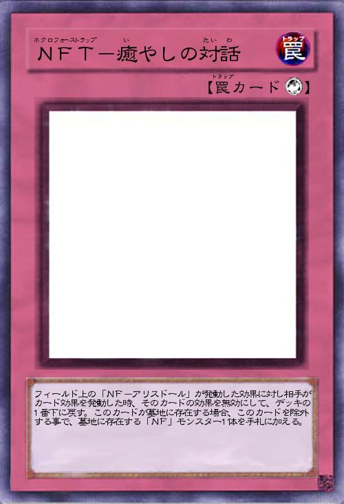 | フィールド上の「NF-アリスドール」が発動した効果に対し相手がカード効果を発動した時、そのカードの効果を無効にして、デッキの1番下に戻す。このカードが墓地に存在する場合、このカードを除外する事で、墓地に存在する「NF」モンスター1体を手札に加える。 | |||
