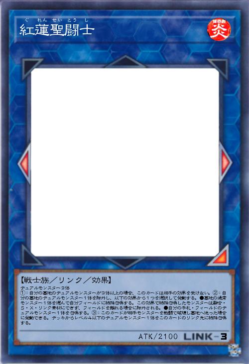 「「紅蓮魔闘士」のリンク化リメイク。デュアルモンスターサポートですが、そもそもとしてデュアルモンスターをそのまま3体並べる事が難しいので、召喚難度はお察しのほど。その代わり出せれば②の効果に回数制限はない時代逆行っぷりを発揮して大量に展開できるので、物量で押し切ります。各種素材にできないという事は「ラプテノス」にも「ワイアーム」にも「メタン・ハイド」にもなれないデュアルにあるまじき状態になりますが、その辺は素のステータスで頑張る形で。」(2017-12-07 23:19)