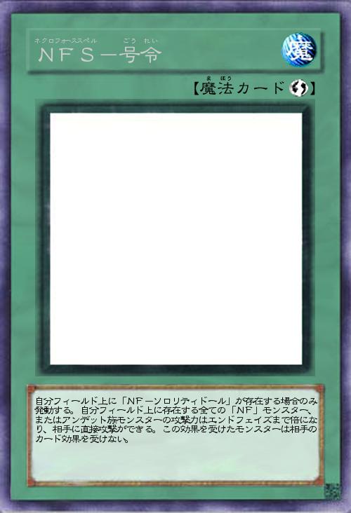| 自分フィールド上に「NF-ソロリティドール」が存在する場合のみ発動する。自分フィールド上に存在する全ての「NF」モンスター、またはアンデット族モンスターの攻撃力はエンドフェイズまで倍になり、相手に直接攻撃ができる。この効果を受けたモンスターは相手のカード効果を受けない。 | |||