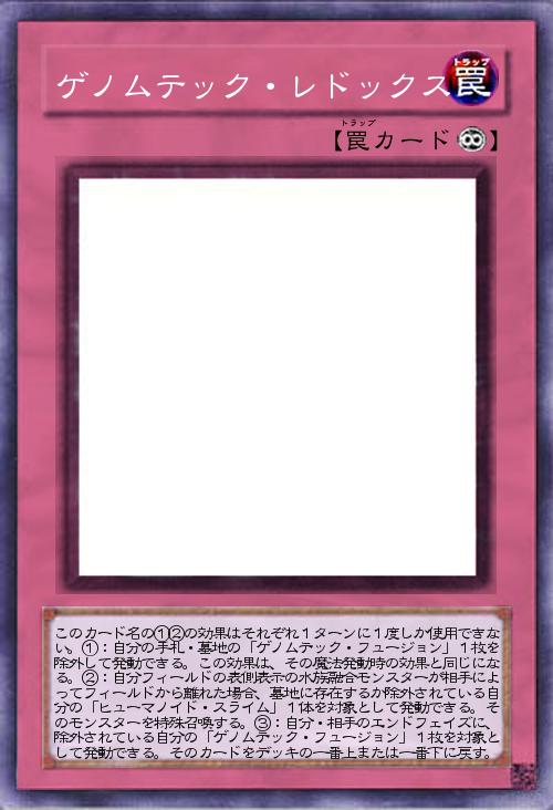 | このカード名の①②の効果はそれぞれ1ターンに1度しか使用できない。①:自分の手札・墓地の「ゲノムテック・フュージョン」1枚を除外して発動できる。この効果は、その魔法発動時の効果と同じになる。②:自分フィールドの表側表示の水族融合モンスターが相手によってフィールドから離れた場合、墓地に存在するか除外されている自分の「ヒューマノイド・スライム」1体を対象として発動できる。そのモンスターを特殊召喚する。③:自分・相手のエンドフェイズに、除外されている自分の「ゲノムテック・フュージョン」1枚を対象として発動できる。そのカードをデッキの一番上または一番下に戻す。 | |||