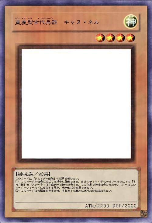 | このカードは「リミッター解除」の効果を受けない。 ①:このカードが召喚に成功した場合に発動できる。自分のデッキ・手札からレベル3以下の「古代兵器」モンスターを1体守備表示で特殊召喚する。この効果で特殊召喚されたモンスターはこのカードがフィールドに存在する限り、表示形式を変更できない。 ②:このカードは攻撃宣言をする時、手札を1枚墓地に送らなければならない。 | |||