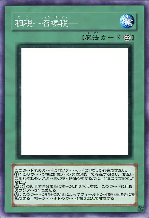| このカード名のカードは自分フィールドに1枚しか存在できない。 ①:このカードが魔法&罠ゾーンに表側表示で存在する限り、お互いはそれぞれモンスターを召喚・特殊召喚する度に、1体につき500LPを払う。 ②:①の効果で自分または相手がLPを払う度に、このカードに租税カウンターを1つ乗せる。 ③:このカードが相手の効果によってフィールドから離れた場合に発動できる。相手フィールドのカード1枚を選んで破壊する。 | |||