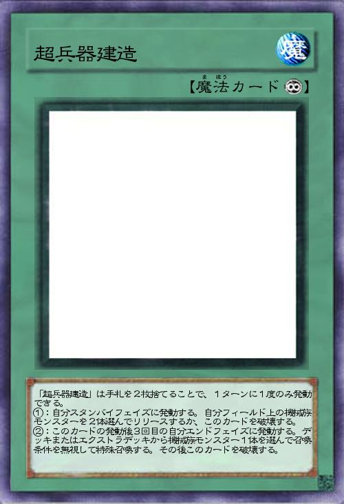 | 「超兵器建造」は手札を2枚捨てることで、1ターンに1度のみ発動できる。 ①:自分スタンバイフェイズに発動する。自分フィールド上の機械族モンスターを2体選んでリリースするか、このカードを破壊する。 ②:このカードの発動後3回目の自分エンドフェイズに発動する。デッキまたはエクストラデッキから機械族モンスター1体を選んで召喚条件を無視して特殊召喚する。その後このカードを破壊する。 | |||