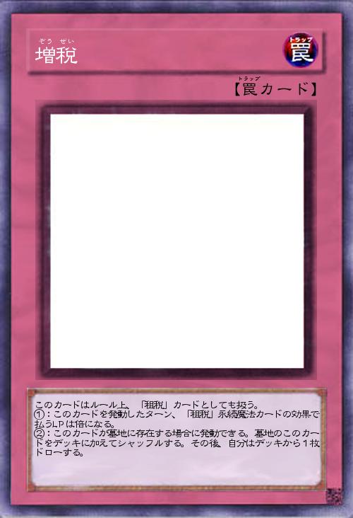 | このカードはルール上、「租税」カードとしても扱う。 ①:このカードを発動したターン、「租税」永続魔法カードの効果で払うLPは倍になる。 ②:このカードが墓地に存在する場合に発動できる。墓地のこのカードをデッキに加えてシャッフルする。その後、自分はデッキから1枚ドローする。 | |||