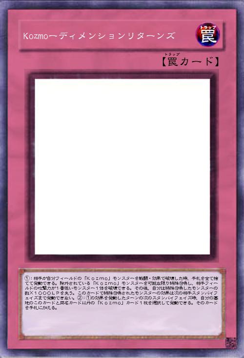 | ①:相手が自分フィールドの「Kozmo」モンスターを戦闘・効果で破壊した時、手札を全て捨てて発動できる。除外されている「Kozmo」モンスターを可能な限り特殊召喚し、相手フィールドの攻撃力が1番低いモンスター1体を破壊できる。その後、自分は特殊召喚したモンスターの数×1000LPを失う。このカードで特殊召喚されたモンスターの効果は次の相手スタンバイフェイズまで発動できない。②:①の効果を発動したターンの次のスタンバイフェイズ時、自分の墓地のこのカードと同名カード以外の「Kozmo」カード1枚を選択して発動できる。そのカードを手札に加える。 | |||