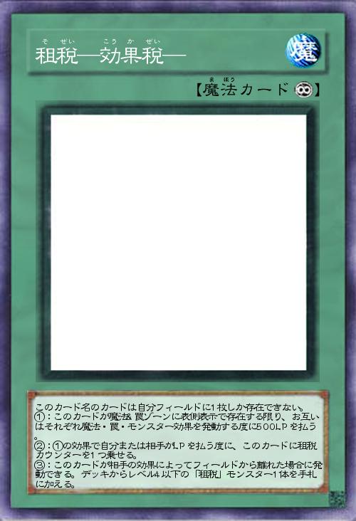 | このカード名のカードは自分フィールドに1枚しか存在できない。 ①:このカードが魔法&罠ゾーンに表側表示で存在する限り、お互いはそれぞれ魔法・罠・モンスター効果を発動する度に500LPを払う。 ②:①の効果で自分または相手がLPを払う度に、このカードに租税カウンターを1つ乗せる。 ③:このカードが相手の効果によってフィールドから離れた場合に発動できる。デッキからレベル4以下の「租税」モンスター1体を手札に加える。 | |||