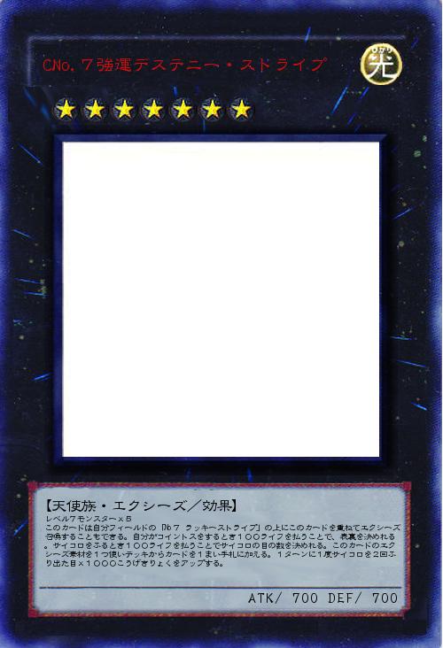 レベル7モンスターx5 このカードは自分フィールドの「No7 ラッキーストライプ」の上にこのカードを重ねてエクシーズ召喚することもできる。自分がコイントスをするとき100ライフを払うことで、表裏を決めれる。サイコロをふるとき100ライフを払うことでサイコロの目の数を決めれる。このカードのエクシーズ素材を1つ使いデッキからカードを1まい手札に加える。1ターンに1度サイコロを2回ふり出た目x1000こうげきりょくをアップする。 |