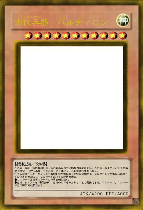 | このカードは「古代兵器」カードの効果以外では特殊召喚できない。このカードをアドバンス召喚する場合、「古代兵器」モンスターを3体リリースしなければならない。 ①:このカードが「リミッター解除」の対象になった時に発動する。このカードを対象にしたカードの効果を無効にし、このカードは以下の効果を得る。 ●このカードは相手のカードの効果を受けない。 ●自分バトルフェイズ開始時に、自分のLPを半分払うことで発動できる。このターン、このカードは2回まで攻撃できる。 | |||
