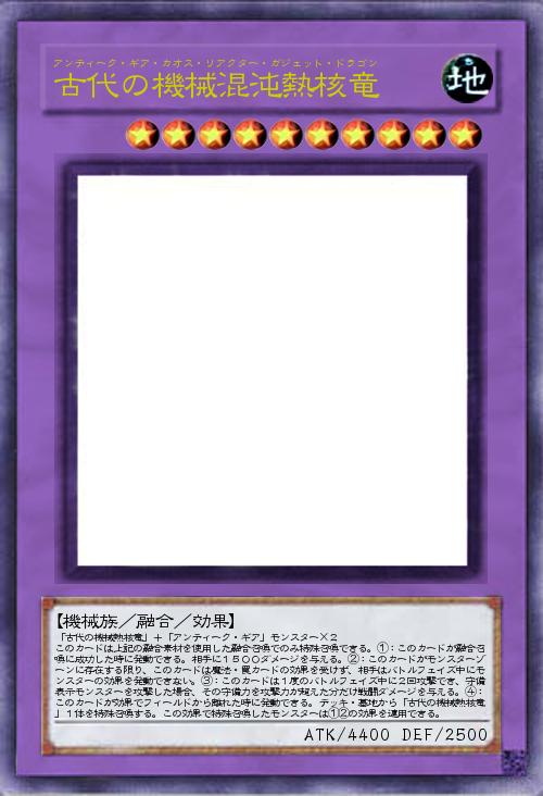 | 「古代の機械熱核竜」+「アンティーク・ギア」モンスター×2 このカードは上記の融合素材を使用した融合召喚でのみ特殊召喚できる。①:このカードが融合召喚に成功した時に発動できる。相手に1500ダメージを与える。②:このカードがモンスターゾーンに存在する限り、このカードは魔法・罠カードの効果を受けず、相手はバトルフェイズ中にモンスターの効果を発動できない。③:このカードは1度のバトルフェイズ中に2回攻撃でき、守備表示モンスターを攻撃した場合、その守備力を攻撃力が超えた分だけ戦闘ダメージを与える。④:このカードが効果でフィールドから離れた時に発動できる。デッキ・墓地から「古代の機械熱核竜」1体を特殊召喚する。この効果で特殊召喚したモンスターは①②の効果を適用できる。 | |||