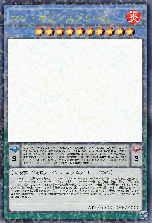 | このカードが「JL」カード以外のカードの効果でPゾーンに置かれた場合、このカードの①のP効果は使用できない。①:相手LPが4000以上及び自分LPが相手LPの半分以下で、相手フィールドに攻撃力3000以上のモンスターが存在する、または相手フィールドにモンスターが3体以上存在する場合に発動できる。自分の手札・フィールドからレベル・ランクの合計が10以上になるようにモンスター2体以上をリリースし、Pゾーンのこのカードを儀式召喚する。 | |||