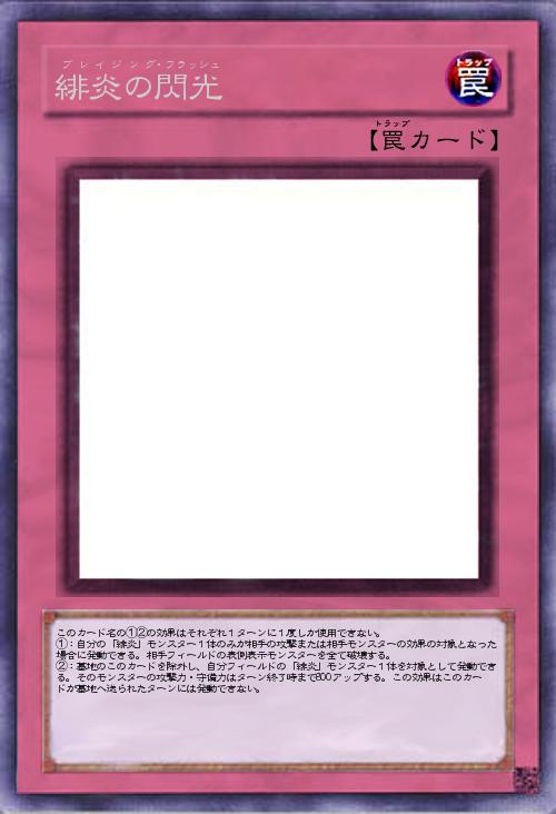 | このカード名の①②の効果はそれぞれ1ターンに1度しか使用できない。 ①:自分の「緋炎」モンスター1体のみが相手の攻撃または相手モンスターの効果の対象となった場合に発動できる。相手フィールドの表側表示モンスターを全て破壊する。 ②:墓地のこのカードを除外し、自分フィールドの「緋炎」モンスター1体を対象として発動できる。そのモンスターの攻撃力・守備力はターン終了時まで800アップする。この効果はこのカードが墓地へ送られたターンには発動できない。 | |||