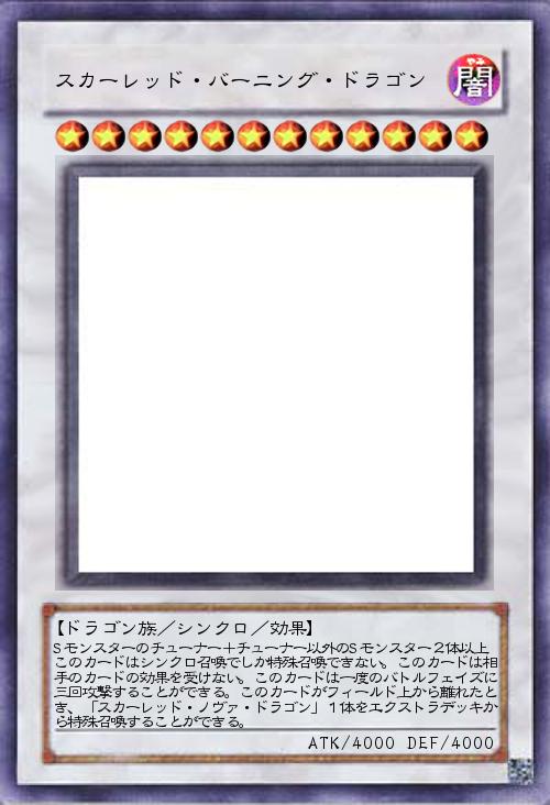 | Sモンスターのチューナー+チューナー以外のSモンスター2体以上 このカードはシンクロ召喚でしか特殊召喚できない。このカードは相手のカードの効果を受けない。このカードは一度のバトルフェイズに三回攻撃することができる。このカードがフィールド上から離れたとき、「スカーレッド・ノヴァ・ドラゴン」1体をエクストラデッキから特殊召喚することができる。 | |||