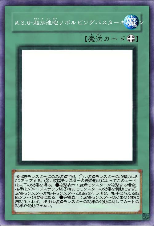 | 機械族モンスターにのみ装備可能。①:装備モンスターの攻撃力は800アップする。②:装備モンスターの表示形式によってこのカードは以下の効果を得る。●攻撃表示:装備モンスターが攻撃する場合、相手はダメージステップ終了時までモンスターの効果を発動できず、装備モンスターが相手モンスターと戦闘を行う場合、相手に与える戦闘ダメージは倍になる。●守備表示:装備モンスターの効果の発動は無効化されず、相手は装備モンスターの効果の発動に対してカードの効果を発動できない。 | |||