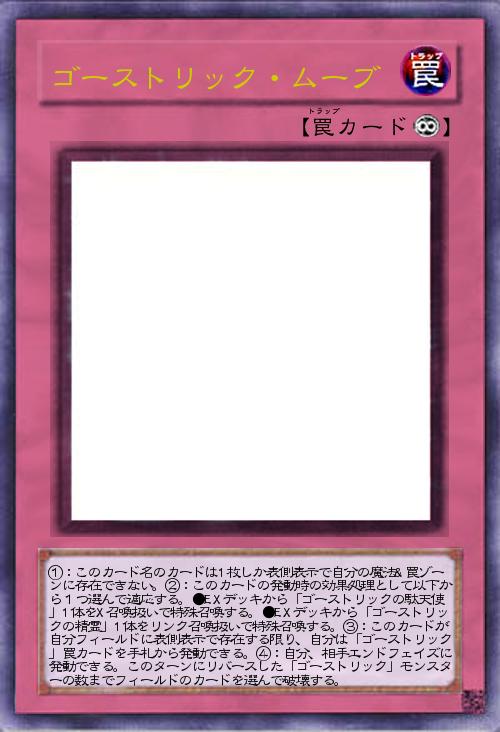| ①:このカード名のカードは1枚しか表側表示で自分の魔法&罠ゾーンに存在できない。②:このカードの発動時の効果処理として以下から1つ選んで適応する。●EXデッキから「ゴーストリックの駄天使」1体をX召喚扱いで特殊召喚する。●EXデッキから「ゴーストリックの精霊」1体をリンク召喚扱いで特殊召喚する。③:このカードが自分フィールドに表側表示で存在する限り、自分は「ゴーストリック」罠カードを手札から発動できる。④:自分、相手エンドフェイズに発動できる。このターンにリバースした「ゴーストリック」モンスターの数までフィールドのカードを選んで破壊する。 | |||