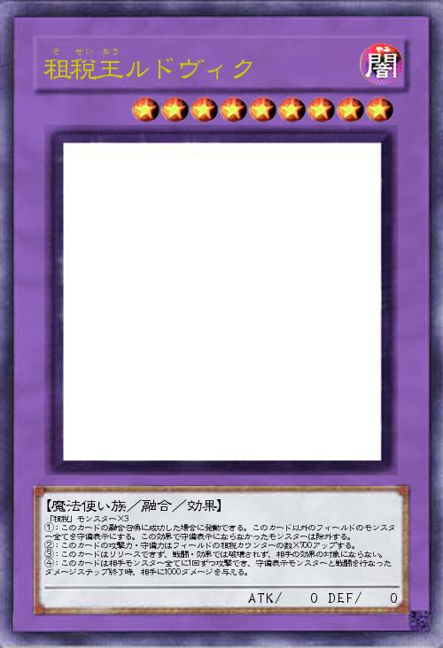 | 「租税」モンスター×3 ①:このカードの融合召喚に成功した場合に発動できる。このカード以外のフィールドのモンスター全てを守備表示にする。この効果で守備表示にならなかったモンスターは除外する。 ②:このカードの攻撃力・守備力はフィールドの租税カウンターの数×700アップする。 ③:このカードはリリースできず、戦闘・効果では破壊されず、相手の効果の対象にならない。 ④:このカードは相手モンスター全てに1回ずつ攻撃でき、守備表示モンスターと戦闘を行なったダメージステップ終了時、相手に1000ダメージを与える。 | |||