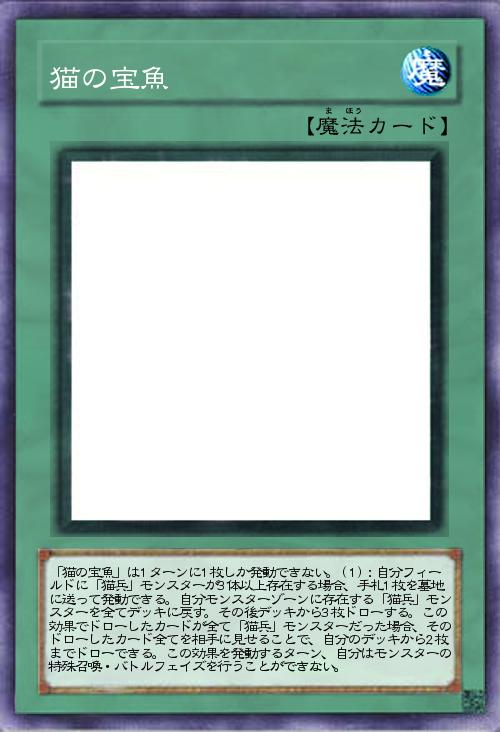 | 「猫の宝魚」は1ターンに1枚しか発動できない。(1):自分フィールドに「猫兵」モンスターが3体以上存在する場合、手札1枚を墓地に送って発動できる。自分モンスターゾーンに存在する「猫兵」モンスターを全てデッキに戻す。その後デッキから3枚ドローする。この効果でドローしたカードが全て「猫兵」モンスターだった場合、そのドローしたカード全てを相手に見せることで、自分のデッキから2枚までドローできる。この効果を発動するターン、自分はモンスターの特殊召喚・バトルフェイズを行うことができない。 | |||