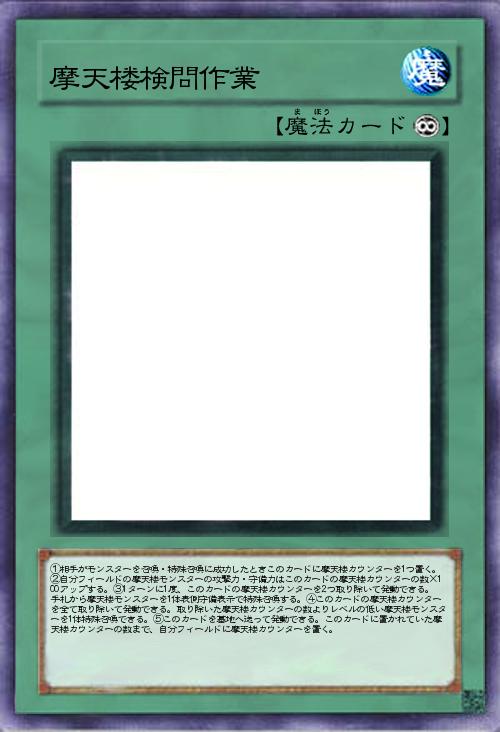 | ①相手がモンスターを召喚・特殊召喚に成功したときこのカードに摩天楼カウンターを1つ置く。②自分フィールドの摩天楼モンスターの攻撃力・守備力はこのカードの摩天楼カウンターの数×100アップする。③1ターンに1度、このカードの摩天楼カウンターを2つ取り除いて発動できる。手札から摩天楼モンスターを1体表側守備表示で特殊召喚する。④このカードの摩天楼カウンターを全て取り除いて発動できる。取り除いた摩天楼カウンターの数よりレベルの低い摩天楼モンスターを1体特殊召喚できる。⑤このカードを墓地へ送って発動できる。このカードに置かれていた摩天楼カウンターの数まで、自分フィールドに摩天楼カウンターを置く。 | |||