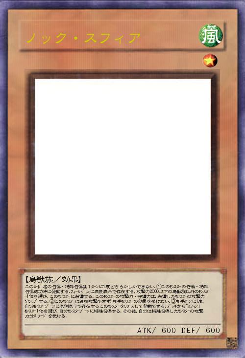 | このカ-ド名の召喚・特殊召喚は1タ-ンに1度どちらかしかできない.①このモンスタ-の召喚・特殊召喚成功時に発動する.フィ-ルド上に表側表示で存在する,攻撃力2000以下の鳥獣族以外のモンスタ-1体を選び,このモンスタ-に装備する.このモンスタ-の攻撃力・守備力は,装備したモンスタ-の攻撃力分アップする.②このモンスタ-は直接攻撃できず,相手モンスタ-の効果を受けない.③相手タ-ンに1度,自分モンスタ-ゾ-ンに表側表示で存在するこのモンスタ-をリリ-スして発動できる.デッキから「スフィア」モンスタ-1体を選び,自分モンスタ-ゾ-ンに特殊召喚する.その後,自分は特殊召喚したモンスタ-の攻撃力分ダメ-ジを受ける. | |||