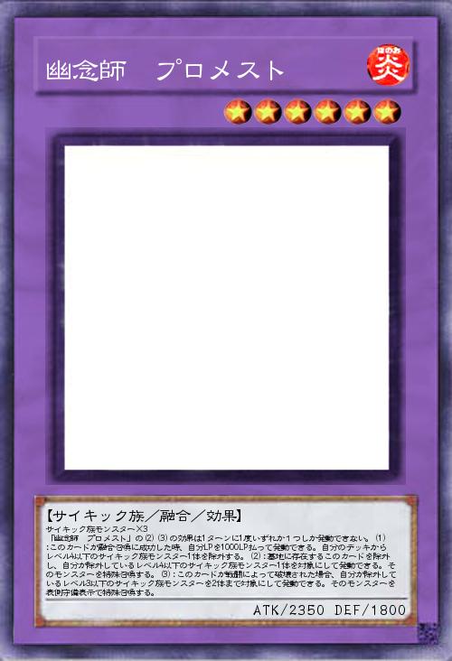 | サイキック族モンスター×3 「幽念師 プロメスト」の(2)(3)の効果は1ターンに1度いずれか1つしか発動できない。(1):このカードが融合召喚に成功した時、自分LPを1000LP払って発動できる。自分のデッキからレベル4以下のサイキック族モンスター1体を除外する。(2):墓地に存在するこのカードを除外し、自分が除外しているレベル4以下のサイキック族モンスター1体を対象にして発動できる。そのモンスターを特殊召喚する。(3):このカードが戦闘によって破壊された場合、自分が除外しているレベル3以下のサイキック族モンスターを2体まで対象にして発動できる。そのモンスターを表側守備表示で特殊召喚する。 | |||