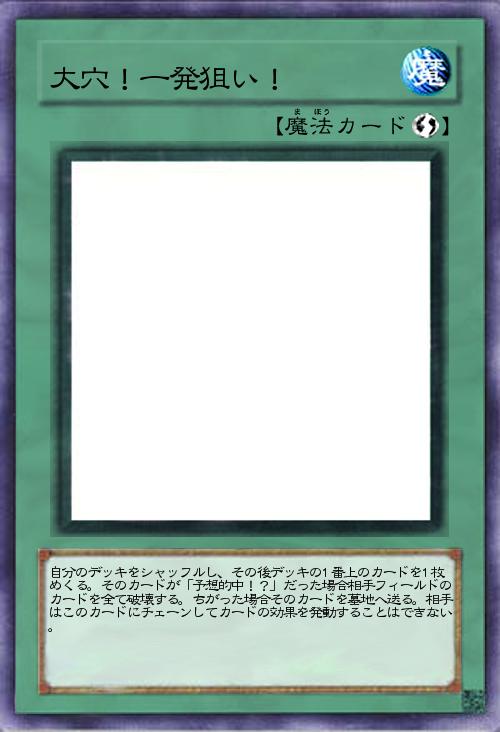 | 自分のデッキをシャッフルし、その後デッキの1番上のカードを1枚めくる。そのカードが「予想的中!?」だった場合相手フィールドのカードを全て破壊する。ちがった場合そのカードを墓地へ送る。相手はこのカードにチェーンしてカードの効果を発動することはできない。 | |||