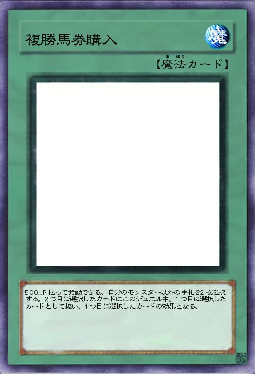 | 500LP払って発動できる。自分のモンスター以外の手札を2枚選択する。2つ目に選択したカードはこのデュエル中、1つ目に選択したカードとして扱い、1つ目に選択したカードの効果となる。 | |||