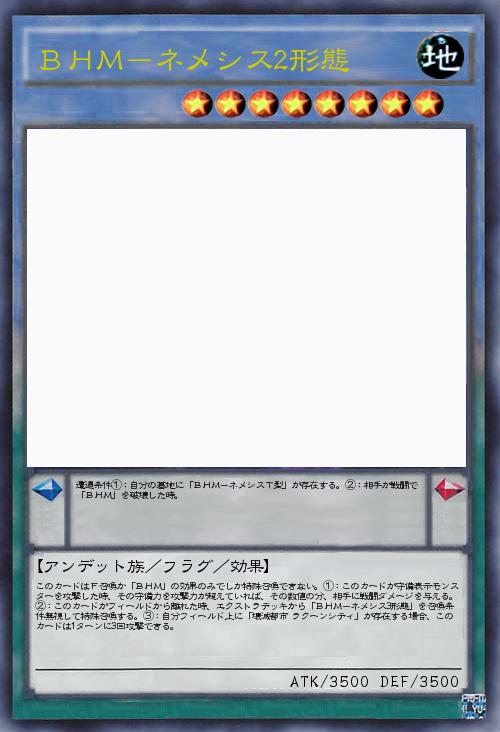 | このカードはF召喚か「BHM」の効果のみでしか特殊召喚できない。①:このカードが守備表示モンスターを攻撃した時、その守備力を攻撃力が超えていれば、その数値の分、相手に戦闘ダメージを与える。②:このカードがフィールドから離れた時、エクストラデッキから「BHM-ネメシス3形態」を召喚条件無視して特殊召喚する。③:自分フィールド上に「壊滅都市 ラクーンシティ」が存在する場合、このカードは1ターンに3回攻撃できる。 | |||