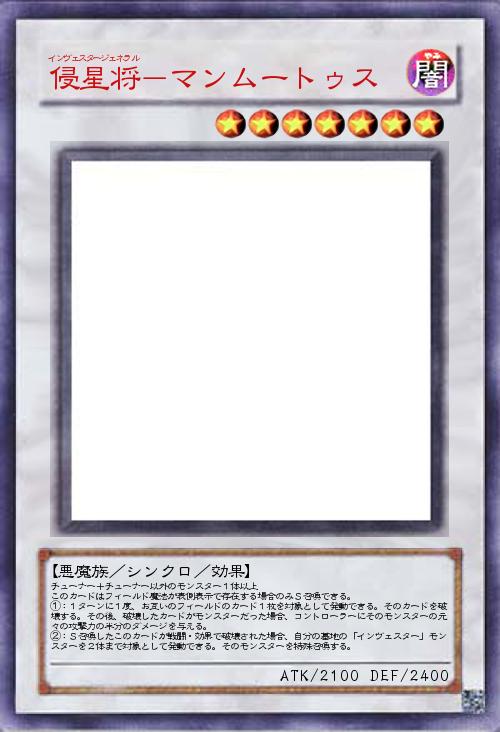 | チューナー+チューナー以外のモンスター1体以上 このカードはフィールド魔法が表側表示で存在する場合のみS召喚できる。 ①:1ターンに1度、お互いのフィールドのカード1枚を対象として発動できる。そのカードを破壊する。その後、破壊したカードがモンスターだった場合、コントローラーにそのモンスターの元々の攻撃力の半分のダメージを与える。 ②:S召喚したこのカードが戦闘・効果で破壊された場合、自分の墓地の「インヴェスター」モンスターを2体まで対象として発動できる。そのモンスターを特殊召喚する。 | |||