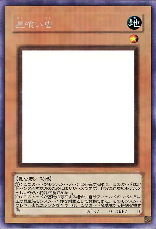 | ①:このカードがモンスターゾーンに存在する限り、このカードはアドバンス召喚以外のためにはリリースできず、自分は昆虫族モンスターしか召喚・特殊召喚できない。 ②:このカードが墓地に存在する場合、自分フィールドのレベル5以上の昆虫族モンスター1体を対象として発動できる。そのモンスターのレベルまたはランクを1つ下げ、このカードを墓地から特殊召喚する。 | |||