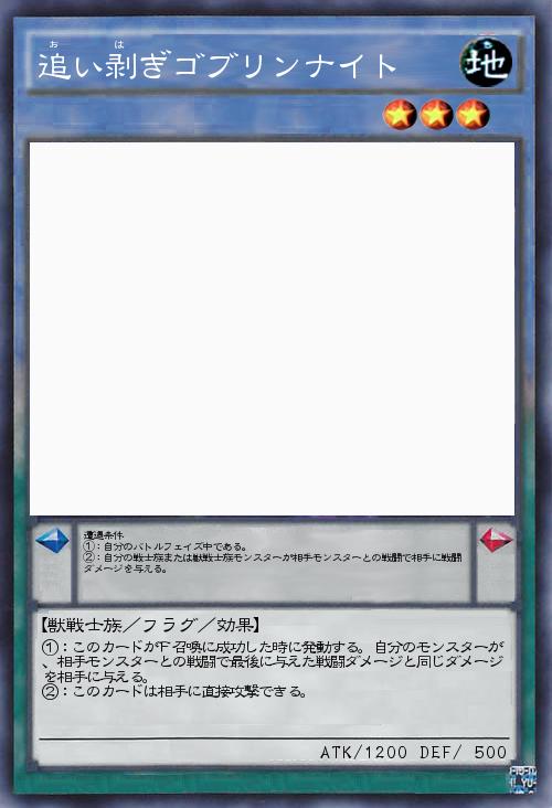今回は追い剥ぎゴブリンのフラグリメイク。追い剥ぎに追加ダメージを与えるのはそのままに、更にもう1回攻撃できるという戦闘能力が増した追い剥ぎゴブリン。条件のせいで自分バトルフェイズ中にしかフラグ召喚できないのが欠点。」(2017-12-22 18:46)