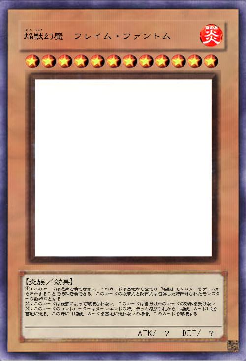 | ①:このカードは通常召喚できない,このカードは墓地から全ての「焔獣」モンスターをゲームから除外することで特殊召喚できる,このカードの攻撃力と防御力は召喚した時除外されたモンスターの数x800となる ②:このカードは戦闘によって破壊されない,このカードは自分以外のカードの効果を受けない ③:このカードのコントローラーはターンエンドの時,デッキ及び手札から「焔獣」カード1枚を墓地に送る,この時に「焔獣」カードを墓地に送れないの場合,このカードを破壊する | |||