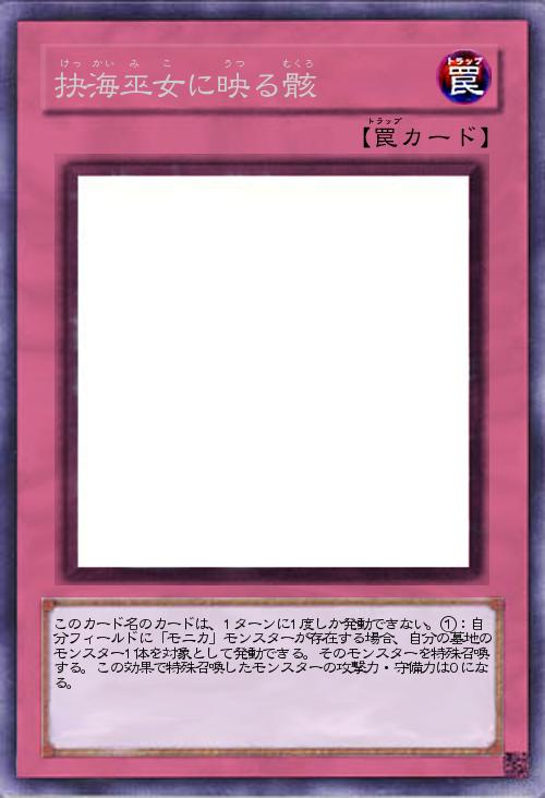 | このカード名のカードは、1ターンに1度しか発動できない。①:自分フィールドに「モニカ」モンスターが存在する場合、自分の墓地のモンスター1体を対象として発動できる。そのモンスターを特殊召喚する。この効果で特殊召喚したモンスターの攻撃力・守備力は0になる。 | |||