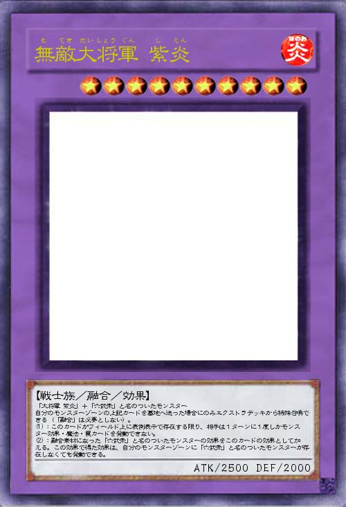 「久々の投稿で効果の変更。召喚条件の変更、従来の六武衆の効果をの使用を継続、大将軍紫炎の効果を強化して追加、効果の対象にならないを削除、これを最終的な形として完成とします。」(2017-12-25 17:34)