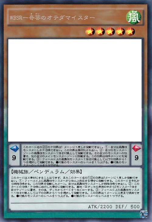 | このカード名の②③のP効果は1ターンに1度しか発動できない。①:自分は風属性モンスターしかP召喚できない。この効果は無効化されない。②:自分のモンスターゾーンの風属性モンスター1体を対象として発動できる。その自分のモンスターの位置を、他の自分のメインモンスターゾーンに移動する。この効果は相手ターンにも発動できる。③:フィールド上の風属性モンスター1体を対象として以下の効果から1つを選択して発動できる。●対象のモンスターのレベルを1つ上げる。●対象のモンスターのレベルを1つ下げる。 | |||