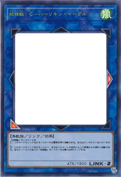 | 「紋様獣」モンスター2体 ①:このカードのリンク先のモンスターの攻撃宣言時に発動できる。自分はデッキから1枚ドローする。 ②:このカードのリンク先のモンスター、またはこのカードが相手によって破壊された場合に発動できる。自分フィールドの全ての「紋様獣」モンスターの攻撃力は800アップする。 | |||