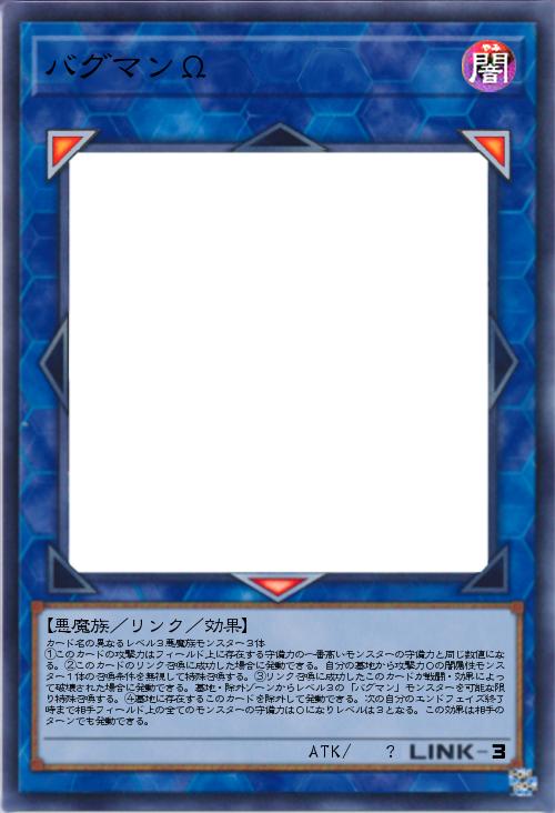 | カード名の異なるレベル3悪魔族モンスター3体 ①このカードの攻撃力はフィールド上に存在する守備力の一番高いモンスターの守備力と同じ数値になる。②このカードのリンク召喚に成功した場合に発動できる。自分の墓地から攻撃力0の闇属性モンスター1体の召喚条件を無視して特殊召喚する。③リンク召喚に成功したこのカードが戦闘・効果によって破壊された場合に発動できる。墓地・除外ゾーンからレベル3の「バグマン」モンスターを可能な限り特殊召喚する。④墓地に存在するこのカードを除外して発動できる。次の自分のエンドフェイズ終了時まで相手フィールド上の全てのモンスターの守備力は0になりレベルは3となる。この効果は相手のターンでも発動できる。 | |||