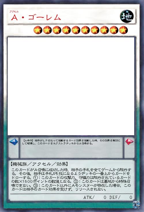 | このカードがA召喚に成功した時、相手の手札を全てゲームから除外する。その後、相手は手札が5枚になるようデッキの一番上からカードをドローする。①:このカードの攻撃力、守備力は除外されているカードの数×1500ポイントの数値となる。②:このカードは墓地から特殊召喚できない。③:このカード以外にAモンスターが存在した場合、このカードは相手のカード効果を受けず、リリースされない。 | |||