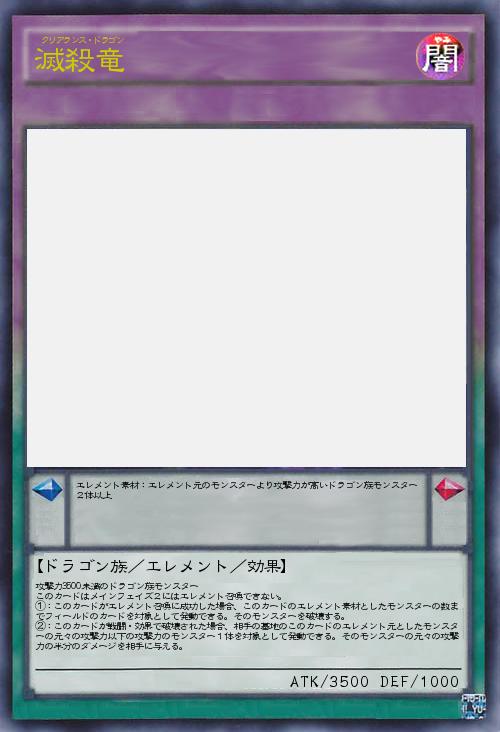 | 攻撃力3500未満のドラゴン族モンスター このカードはメインフェイズ2にはエレメント召喚できない。 ①:このカードがエレメント召喚に成功した場合、このカードのエレメント素材としたモンスターの数までフィールドのカードを対象として発動できる。そのモンスターを破壊する。 ②:このカードが戦闘・効果で破壊された場合、相手の墓地のこのカードのエレメント元としたモンスターの元々の攻撃力以下の攻撃力のモンスター1体を対象として発動できる。そのモンスターの元々の攻撃力の半分のダメージを相手に与える。 | |||