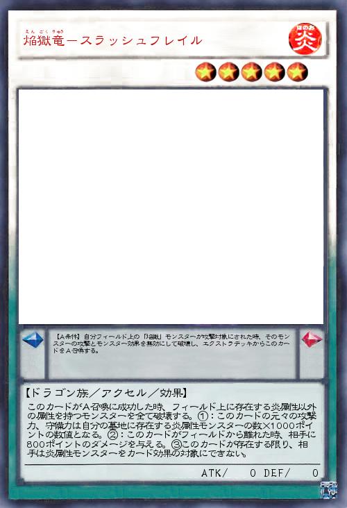 | 【A条件】自分フィールド上の「焔獄」モンスターが攻撃対象にされた時、そのモンスターの攻撃とモンスター効果を無効にして破壊し、エクストラデッキからこのカードをA召喚する。 | |||