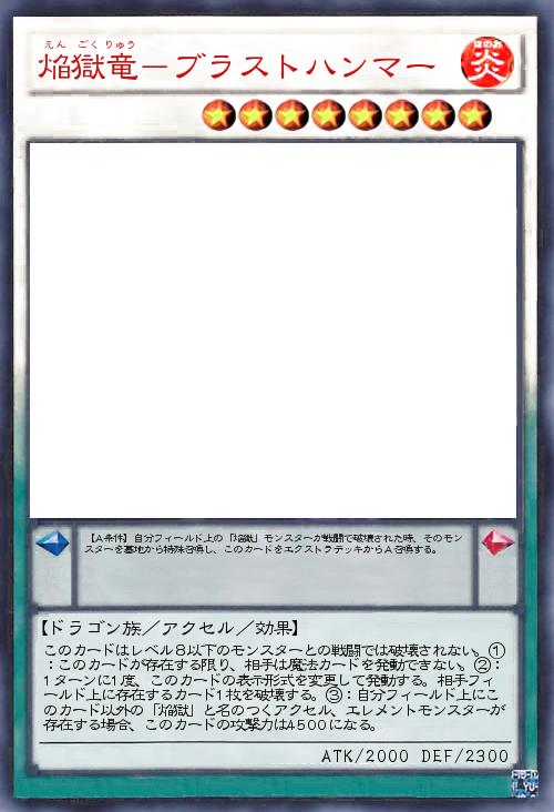 | このカードはレベル8以下のモンスターとの戦闘では破壊されない。①:このカードが存在する限り、相手は魔法カードを発動できない。②:1ターンに1度、このカードの表示形式を変更して発動する。相手フィールド上に存在するカード1枚を破壊する。③:自分フィールド上にこのカード以外の「焔獄」と名のつくアクセル、エレメントモンスターが存在する場合、このカードの攻撃力は4500になる。 | |||