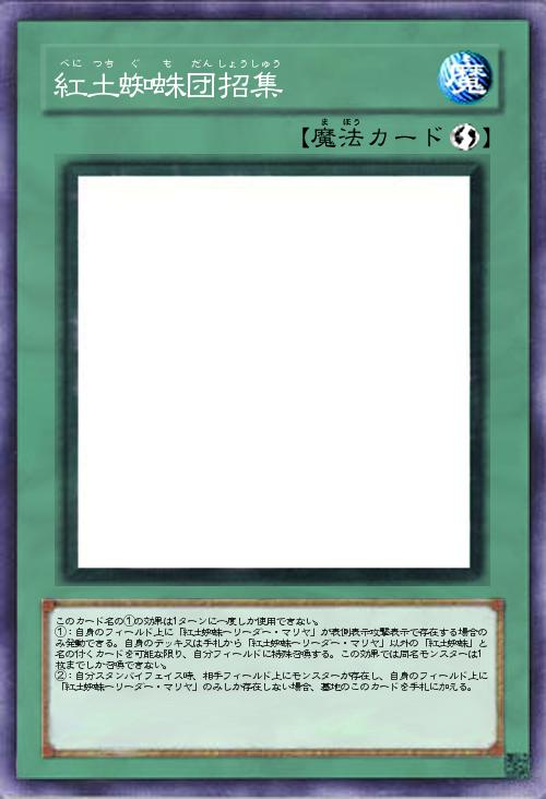 | このカード名の①の効果は1ターンに一度しか使用できない。 ①:自身のフィールド上に「紅土蜘蛛ーリーダー・マリヤ」が表側表示攻撃表示で存在する場合のみ発動できる。自身のデッキ又は手札から「紅土蜘蛛ーリーダー・マリヤ」以外の「紅土蜘蛛」と名の付くカードを可能な限り、自分フィールドに特殊召喚する。この効果では同名モンスターは1枚までしか召喚できない。 ②:自分スタンバイフェイス時、相手フィールド上にモンスターが存在し、自身のフィールド上に「紅土蜘蛛ーリーダー・マリヤ」のみしか存在しない場合、墓地のこのカードを手札に加える。 | |||