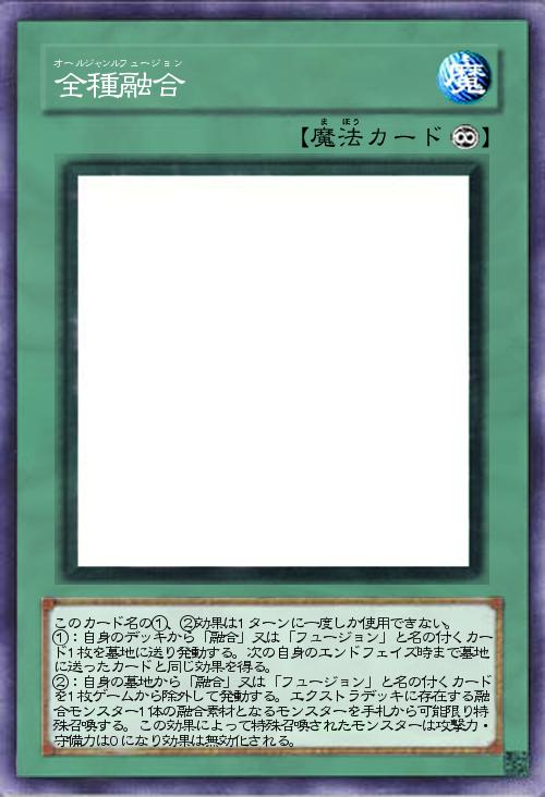 | このカード名の①、②効果は1ターンに一度しか使用できない。 ①:自身のデッキから「融合」又は「フュージョン」と名の付くカード1枚を墓地に送り発動する。次の自身のエンドフェイズ時まで墓地に送ったカードと同じ効果を得る。 ②:自身の墓地から「融合」又は「フュージョン」と名の付くカードを1枚ゲームから除外して発動する。エクストラデッキに存在する融合モンスター1体の融合素材となるモンスターを手札から可能限り特殊召喚する。この効果によって特殊召喚されたモンスターは攻撃力・守備力は0になり効果は無効化される。 | |||