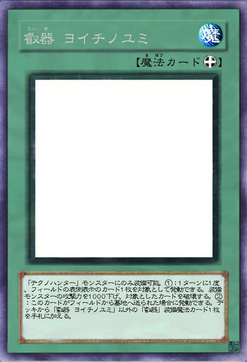 | 「テクノハンター」モンスターにのみ装備可能。①:1ターンに1度、フィールドの表側表示のカード1枚を対象として発動できる。装備モンスターの攻撃力を1000下げ、対象としたカードを破壊する。②:このカードがフィールドから墓地へ送られた場合に発動できる。デッキから「叡器 ヨイチノユミ」以外の「叡器」装備魔法カード1枚を手札に加える。 | |||