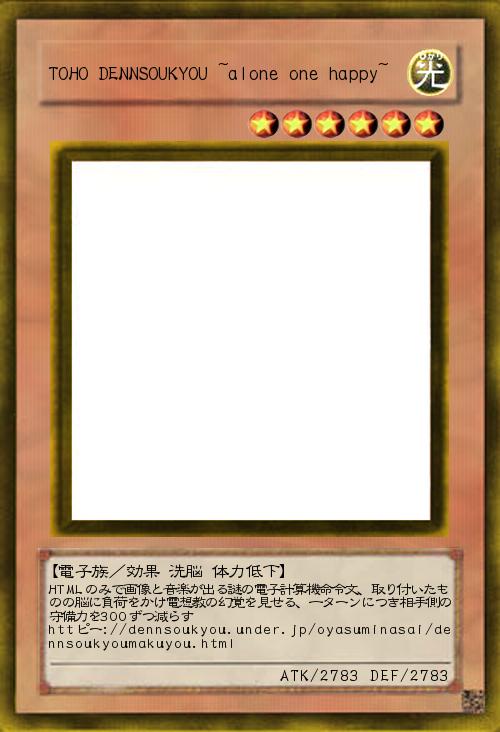 | HTMLのみで画像と音楽が出る謎の電子計算機命令文、取り付いたものの脳に負荷をかけ電想教の幻覚を見せる、一ターンにつき相手側の守備力を300ずつ減らす httピー://dennsoukyou.under.jp/oyasuminasai/dennsoukyoumakuyou.html | |||