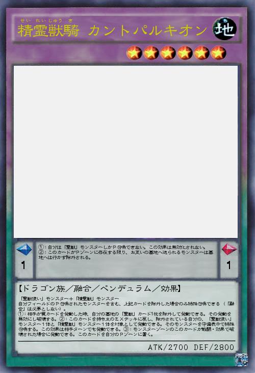 | 「霊獣使い」モンスター+「精霊獣」モンスター 自分フィールドのP召喚されたモンスターを含む、上記カードを除外した場合のみ特殊召喚できる(「融合」は必要としない)。 ①:相手が罠カードを発動した時、自分の墓地の「霊獣」カード1枚を除外して発動できる。その発動を無効にし破壊する。②:このカードを持ち主のEXデッキに戻し、除外されている自分の、「霊獣使い」モンスター1体と「精霊獣」モンスター1体を対象として発動できる。そのモンスターを守備表示で特殊召喚する。この効果は相手ターンでも発動できる。③:モンスターゾーンのこのカードが戦闘・効果で破壊された場合に発動できる。このカードを自分のPゾーンに置く。 | |||